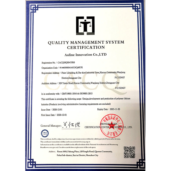 This certification is in conformity with GB/TI9001-2016 idt ISO9001:2015, it's covering the following scope: Design, development and production of polymer lithium batteries.